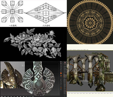 每名学员入校后的基础各不相同,专职讲师将会与你一对一交流,从认识素描并了解素描对游戏制作的重要性开始,一直到学习基础透视理论,学习构图技巧等等。像这样的基础部分要求彻底巩固。因为不管是今后做3D或是画原画,不管是角色或是场景,基础扎实才是王道。如右图,从几何体,正方十字体,到复杂的静物组合的素描都要认真对待。